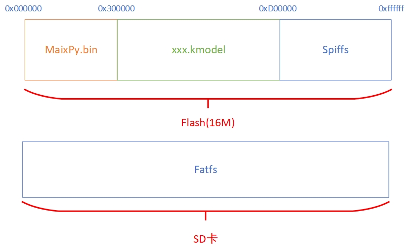 As can be seen from the above figure, the storage medium in MaixPy is mainly composed of Flash and SD cards, which are divided into three areas, namely MaixPy.bin firmware area, xxx.kmodel model area, and file system area: Flash is spiffs (SPI Flash File System), SD card is Fatfs (FAT file system).