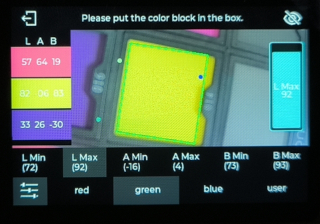 LAB valuesof the object color calculated in step 2, adjustL Min,L Max,A Min,A Max,B Min,B Maxto appropriate values to identify the corresponding color blobs. For example, ifLAB = (20, 50, 80), sinceL=20, to accommodate a certain range, setL Min=10andL Max=30. Similarly, sinceA=50, setA Min=40andA Max=60. SinceB=80, setB Min=70andB Max=90.