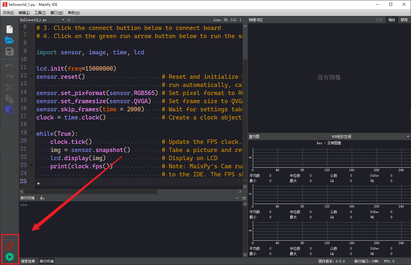 Open the file, and then click the execute button to execute it. Note: The execution code is similar to the REPL execution code, except that the program is sent to the development board and not saved to the file system. It is executed once