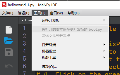 Of course, you can also click Save the opened file as boot.py to save the code to the boot.py file of the development board. This file will be executed automatically next time the development board is powered on.